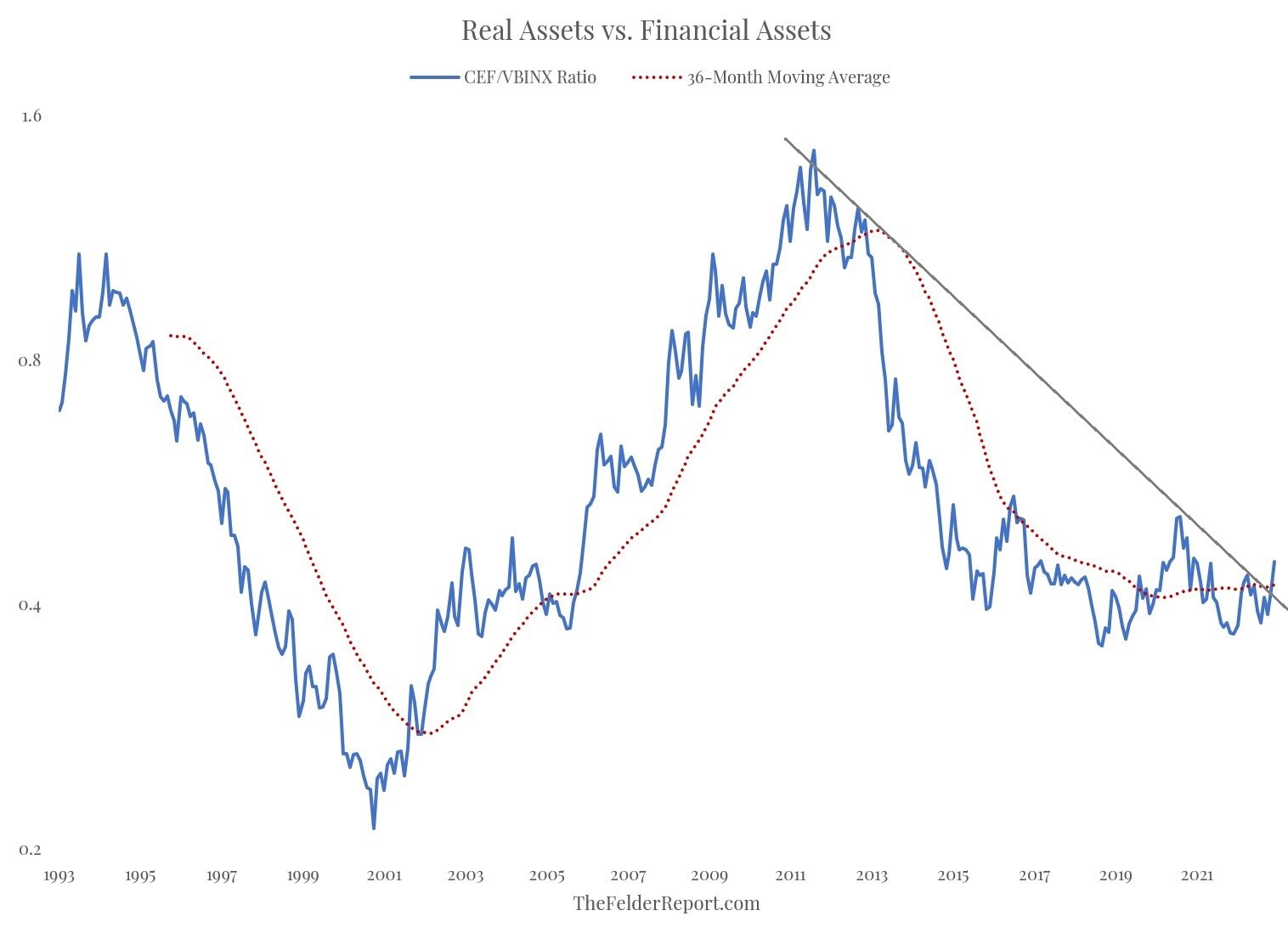 È difficile rispondere a questa domanda partendo solo da una prospettiva macro. Forse è più semplice rispondere per esempio analizzando la storia trentennale del rapporto tra lo Sprott Physical Gold and Silver Trust (CEF) e il Vanguard Balanced Index Fund (VBINX – un tradizionale portafoglio 60/40). Questo mostra chiaramente che ci sono tempi per possedere metalli preziosi e tempi per possedere azioni e obbligazioni. Inoltre, questi periodi in genere restano in tendenza per un certo numero di anni prima di invertire ed andare nella direzione opposta.