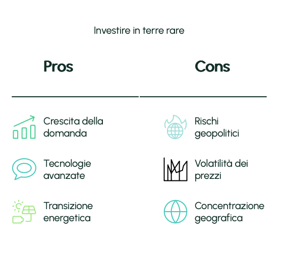 - Le terre rare sono strategiche per il futuro tecnologico ed energetico, ma il loro mercato è caratterizzato da alta volatilità.