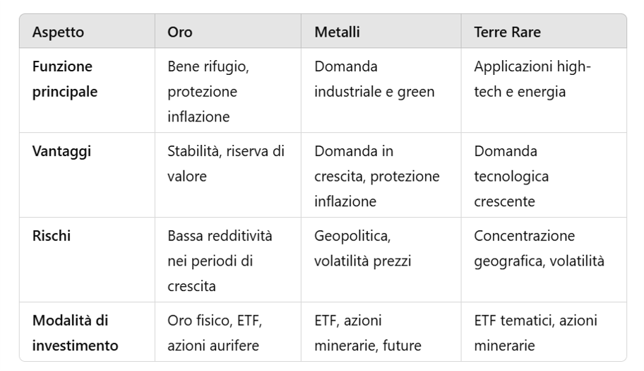 Le materie prime offrono protezione contro l’inflazione, diversificazione e opportunità di rendimento in cicli economici differenti. In questa analisi approfondiremo il ruolo dell’oro, dei metalli industriali e delle terre rare, evidenziando vantaggi, rischi e modalità operative per investire in questi asset.