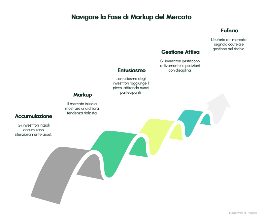 Il mercato prende direzione. I massimi e minimi diventano crescenti. I volumi aumentano. L’entusiasmo cresce. È la fase in cui la tendenza rialzista si manifesta con chiarezza.