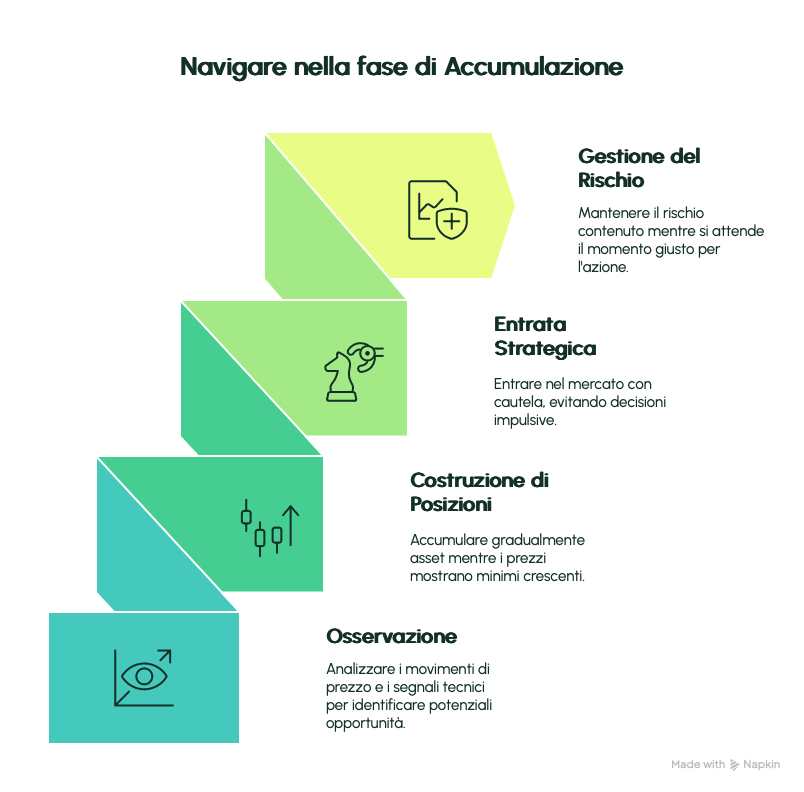 È la fase più silenziosa, meno appariscente. I prezzi si muovono lateralmente dopo una discesa, la volatilità si riduce, i volumi si assottigliano. Ma sotto la superficie qualcosa si sta preparando.