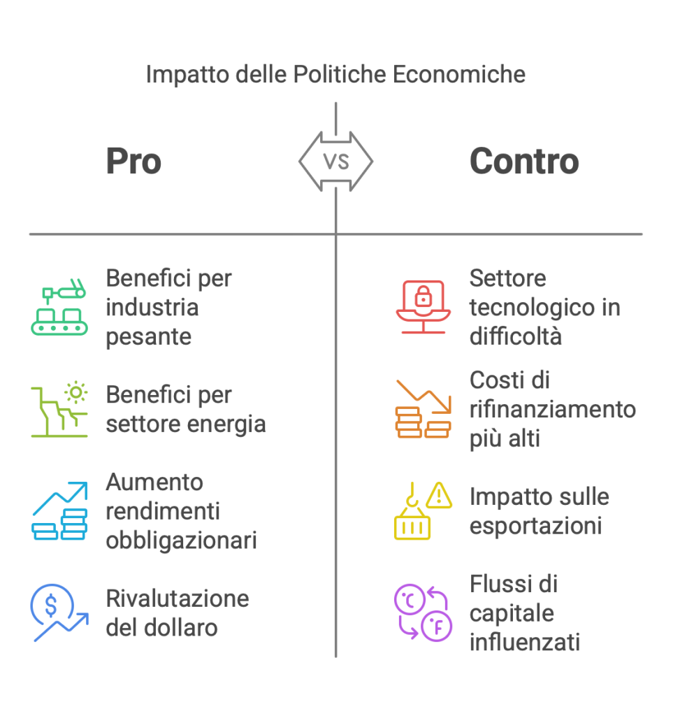 • Mercati azionari: Settori come l’industria pesante e l’energia potrebbero beneficiare di politiche protezionistiche, mentre il settore tecnologico potrebbe risentire delle restrizioni commerciali.
