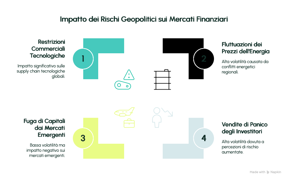 - Le tensioni geopolitiche possono causare una fuga di capitali da mercati emergenti verso mercati considerati più sicuri. Ciò impatta negativamente sulle valute locali e sulle borse dei paesi colpiti.