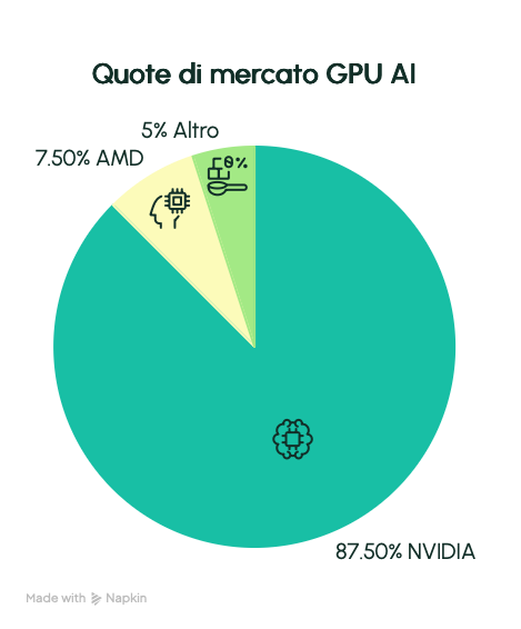 Quote di mercato GPU AI: NVIDIA domina con l’85-90%, ma AMD sta conquistando un solido 5-10%, con margini di crescita significativi.