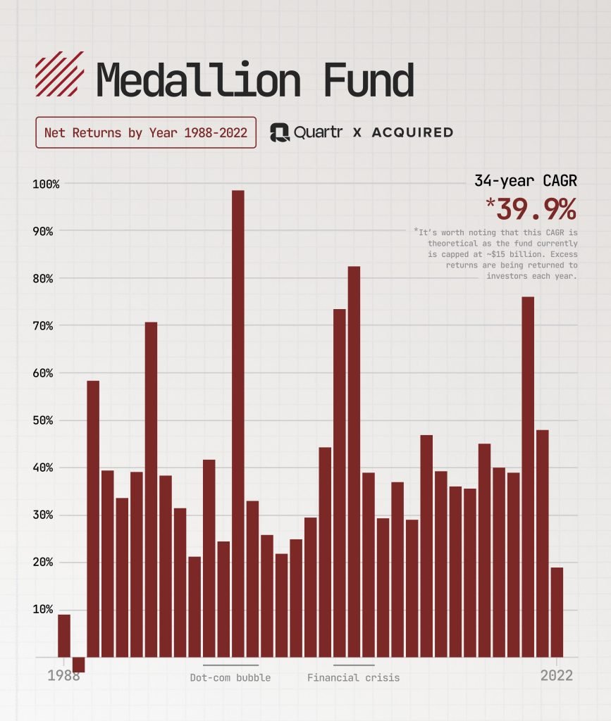 • Performance Straordinaria: Il Medallion Fund ha costantemente sovraperformato i mercati per oltre 30 anni.