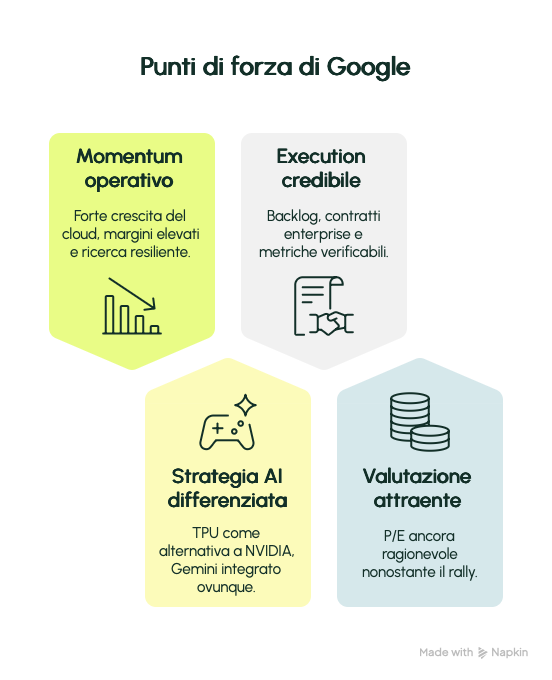 - Strategia AI differenziata: TPU come alternativa a NVIDIA, Gemini integrato ovunque