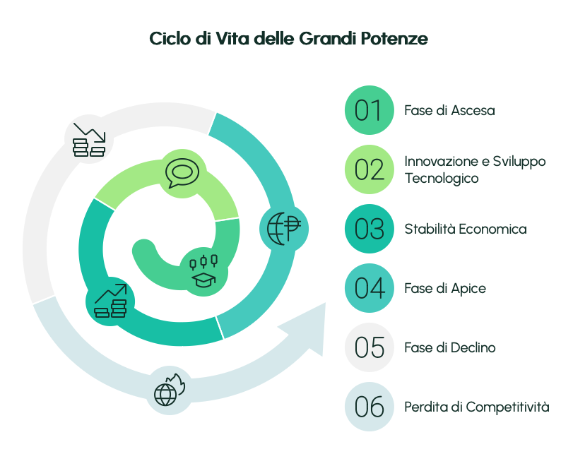Dalio ha mappato con straordinaria precisione il ciclo di vita delle grandi potenze. Ogni impero segue uno schema ricorrente: