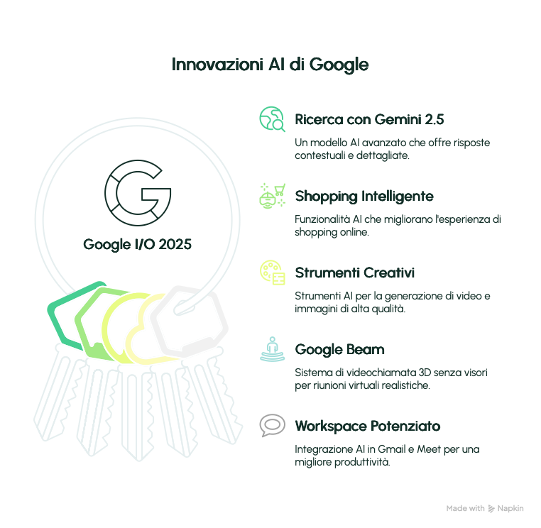 Strumenti Creativi: Google ha presentato Veo 3 per la generazione di video e Imagen 4 per immagini di alta qualità, insieme a Flow, uno strumento che permette agli utenti di creare storyboard e modificare video usando il linguaggio naturale.