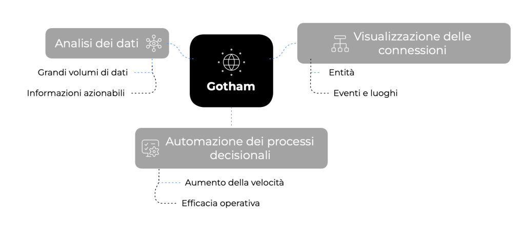 Gotham, inizialmente sviluppato per applicazioni governative, è una piattaforma progettata per supportare operazioni complesse e decisioni critiche. Utilizzata da agenzie di difesa e intelligence, Gotham consente di: