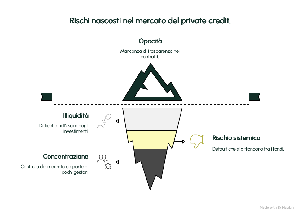 Rischio sistemico: un’ondata di default in un settore specifico (ad esempio real estate o retail) potrebbe contagiare rapidamente diversi fondi, amplificando gli effetti sul sistema finanziario.
