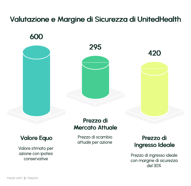 Veniamo al punto cruciale: la valutazione. Utilizzando un modello DCF (Discounted Cash Flow) con ipotesi conservative – crescita dei ricavi a una cifra media per il prossimo decennio, margini stabili e un ROIC del 15% – il valore equo di UnitedHealth si attesta intorno a $600 per azione. Con il titolo attualmente scambiato a circa $295, offre un margine di sicurezza superiore al 50%. Anche assumendo uno scenario più cauto con un margine di sicurezza del 30%, il prezzo di ingresso ideale sarebbe $420, ancora ben sopra il valore attuale.